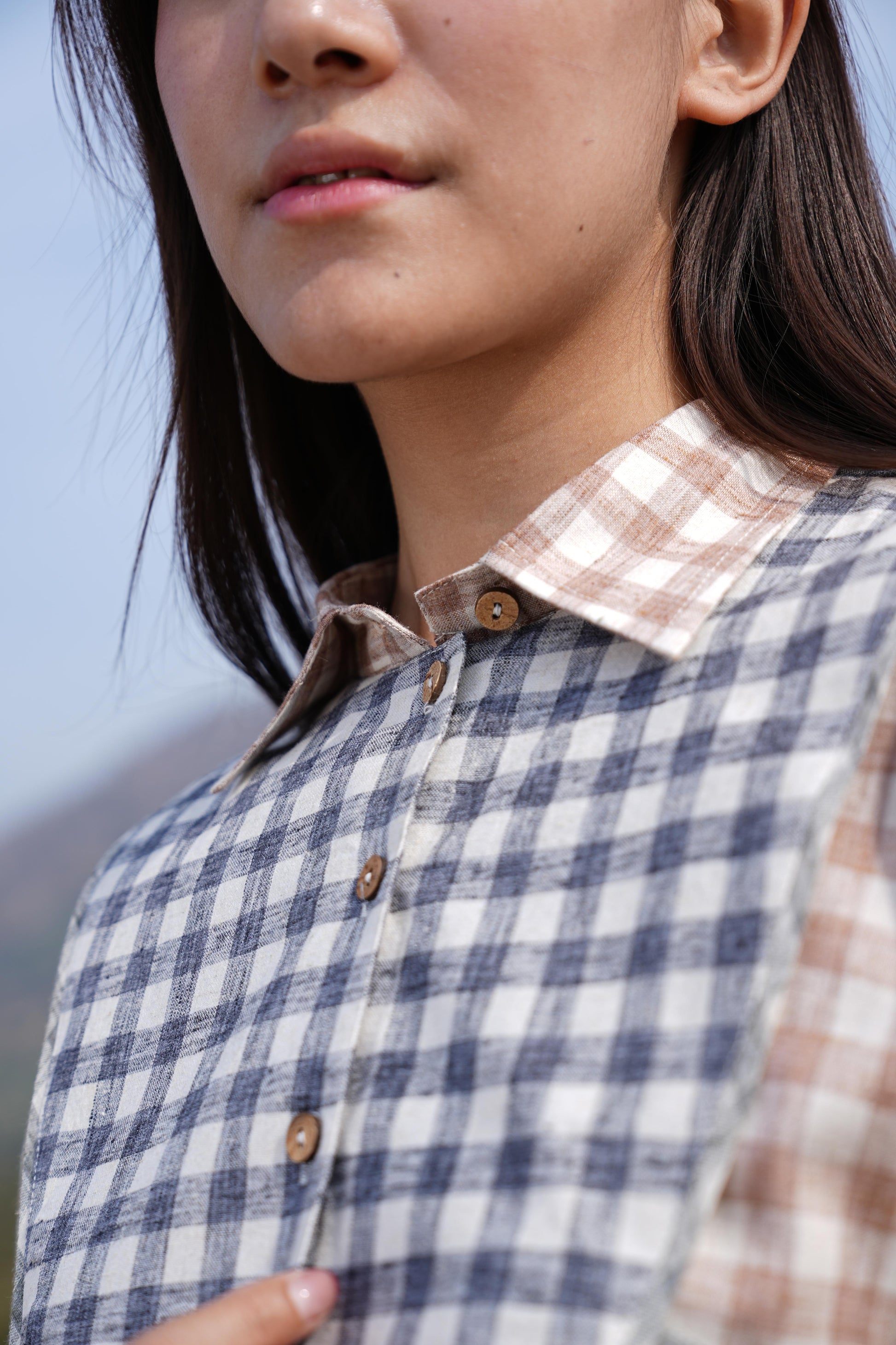 - Shirt-style collar with a front button placket