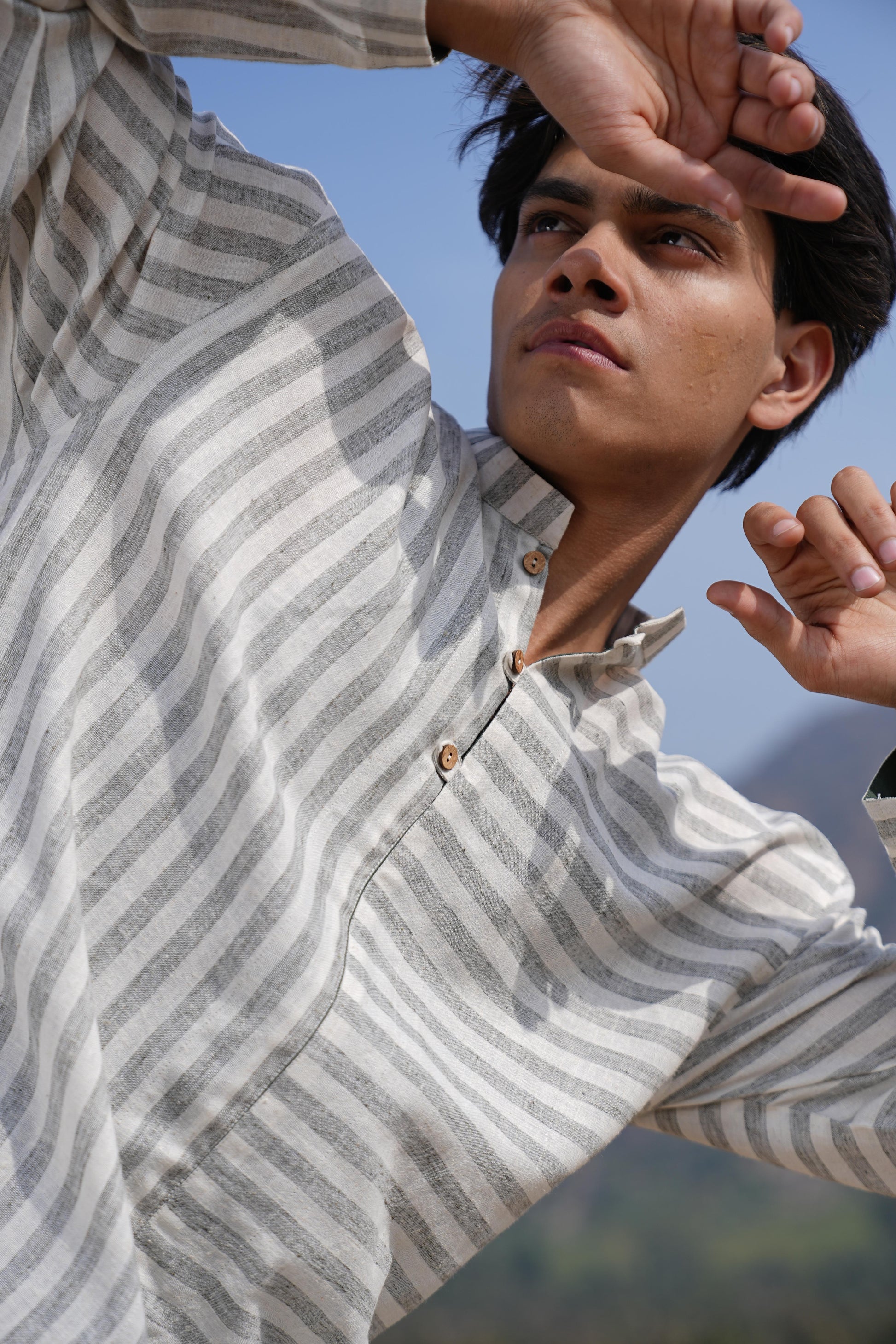 - Details: Band (mandarin) collar with Short center-front placket with subtle buttons.